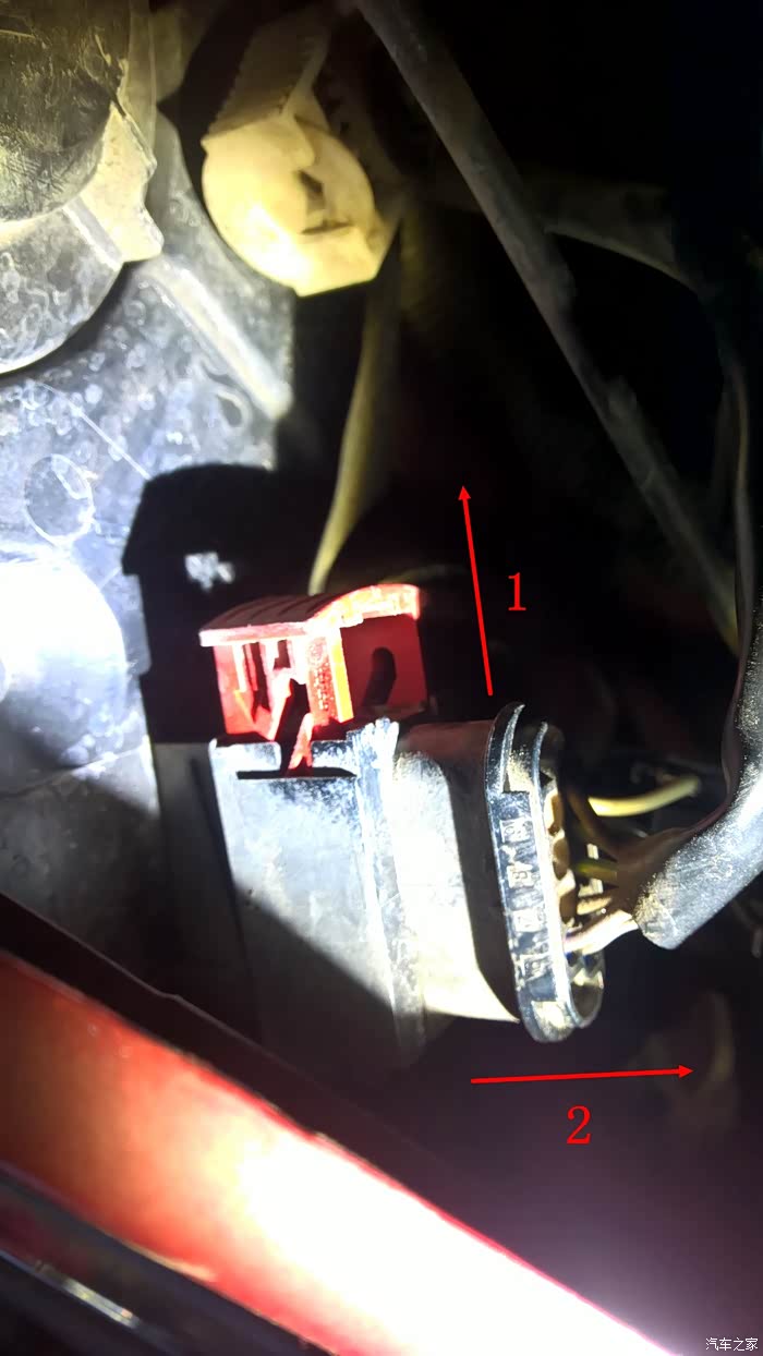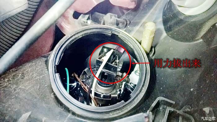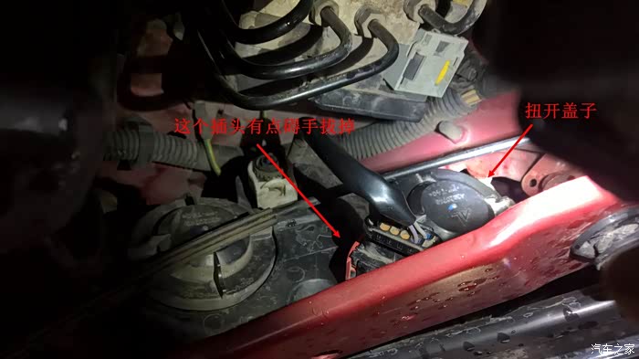 把头探进去,右边的盖子,左边对应的是远光灯,大家一看便知。但是空间有显,只能左手操作,先把旁边的一个插头拔掉