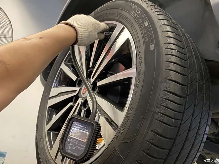 师傅正在检查轮胎的胎压情况,车子一般都在城市里开,所以磨损情况还算可以。