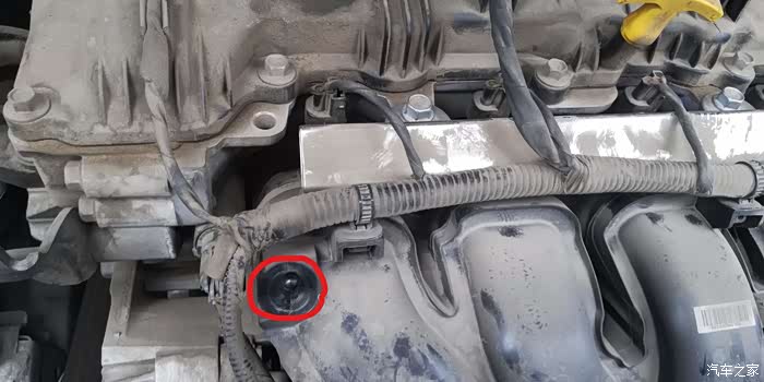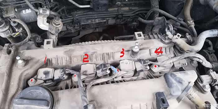 取出火花塞的顺序,下面的红点就是松开点火线圈的螺丝。