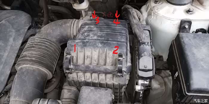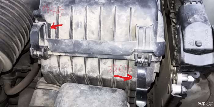 空气滤芯的盒子后部也两个卡子,需要拨开才能打开盒子上盖。就在红色箭头下面
