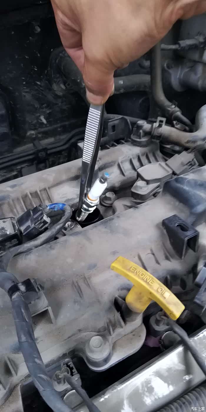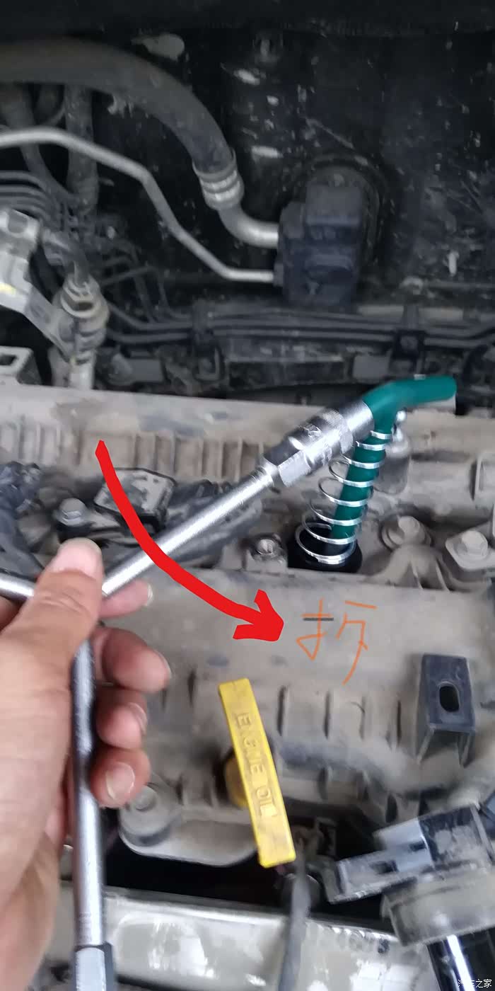 逆时针旋转拆出火花塞,因为套筒手柄太短,力矩不够,所以我加了一个套筒省力。
