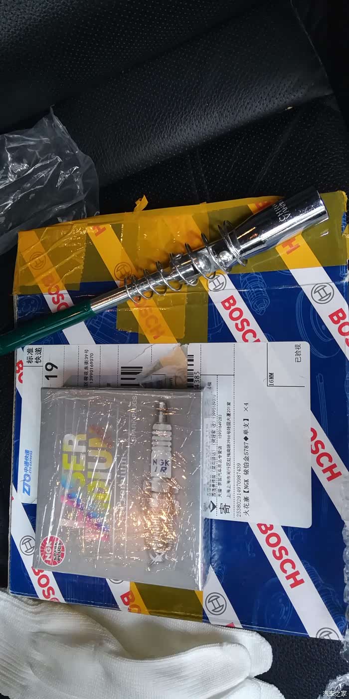 网购的火花塞,4只188元,NGK的ILZKR7B11,与原厂一样,商家还送火花塞套筒一只。