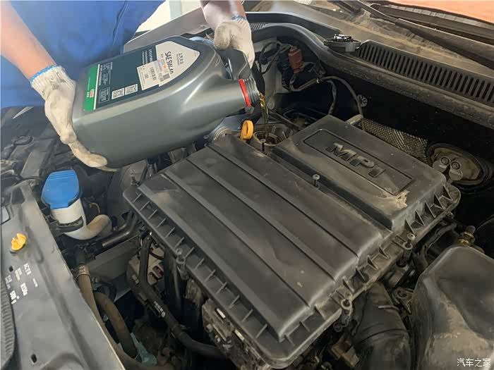安装完汽油滤芯后,放下爱车,开始加注新的半合成机油。