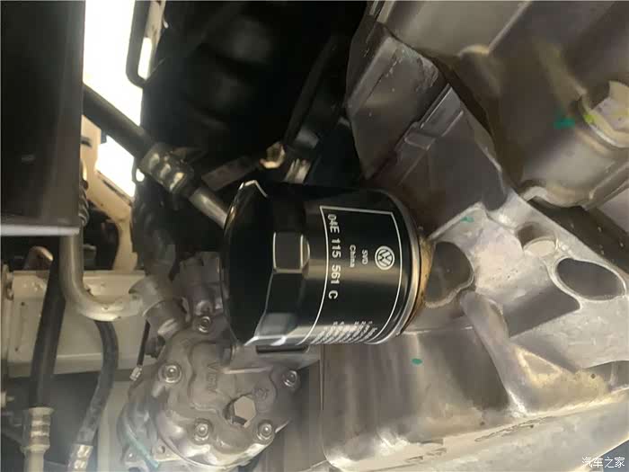 安装新的机油滤芯,上一代发动机的机油滤芯在上方,现在EA211发动机的机油滤芯全部在底部。