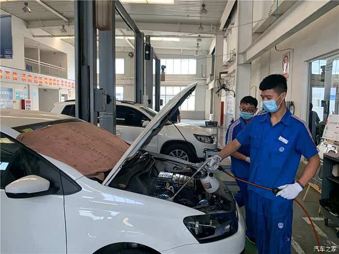 首先维修师傅给爱车进行发动机仓的清洗。