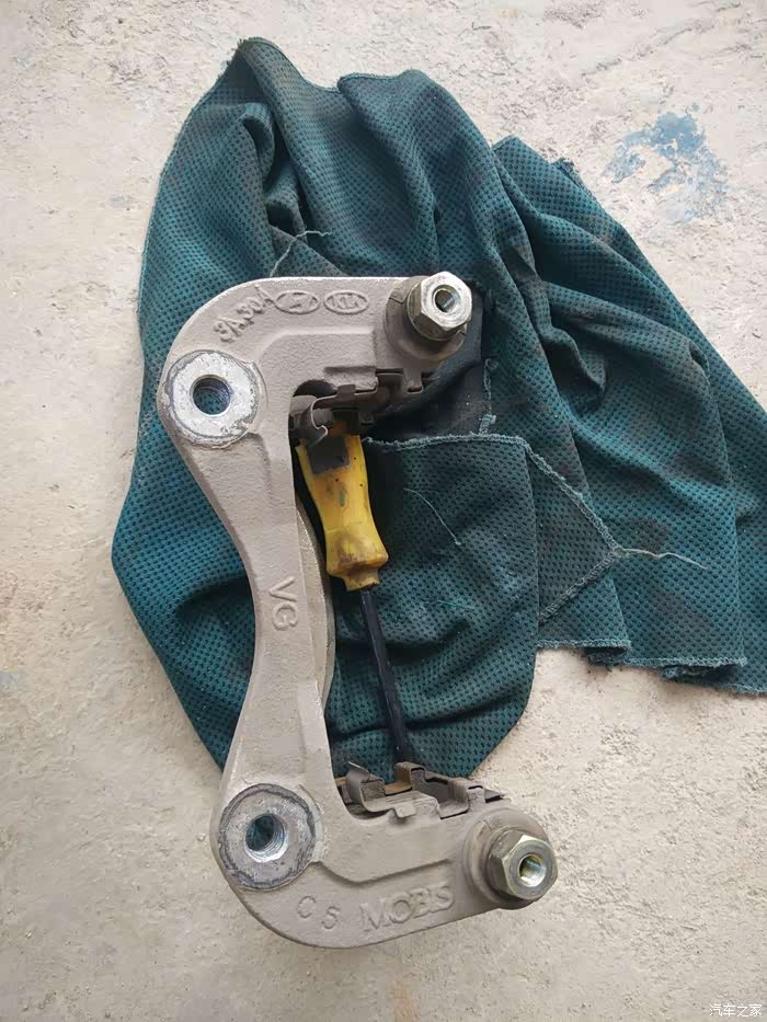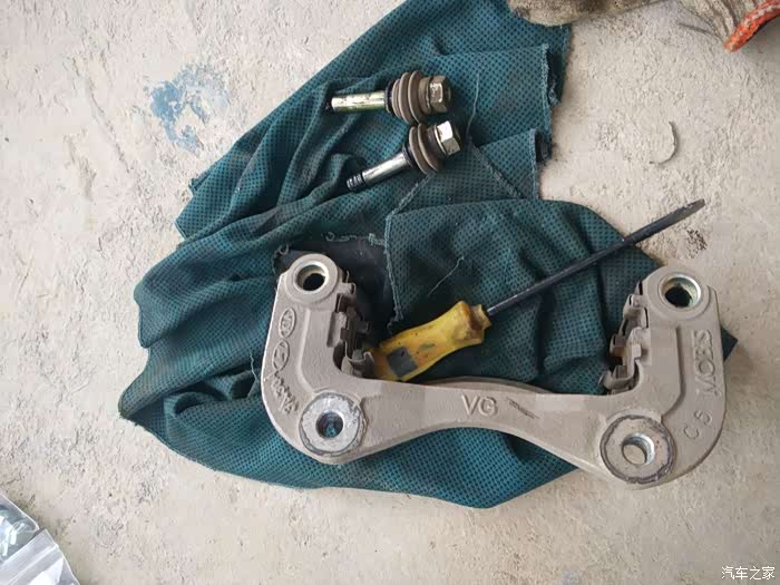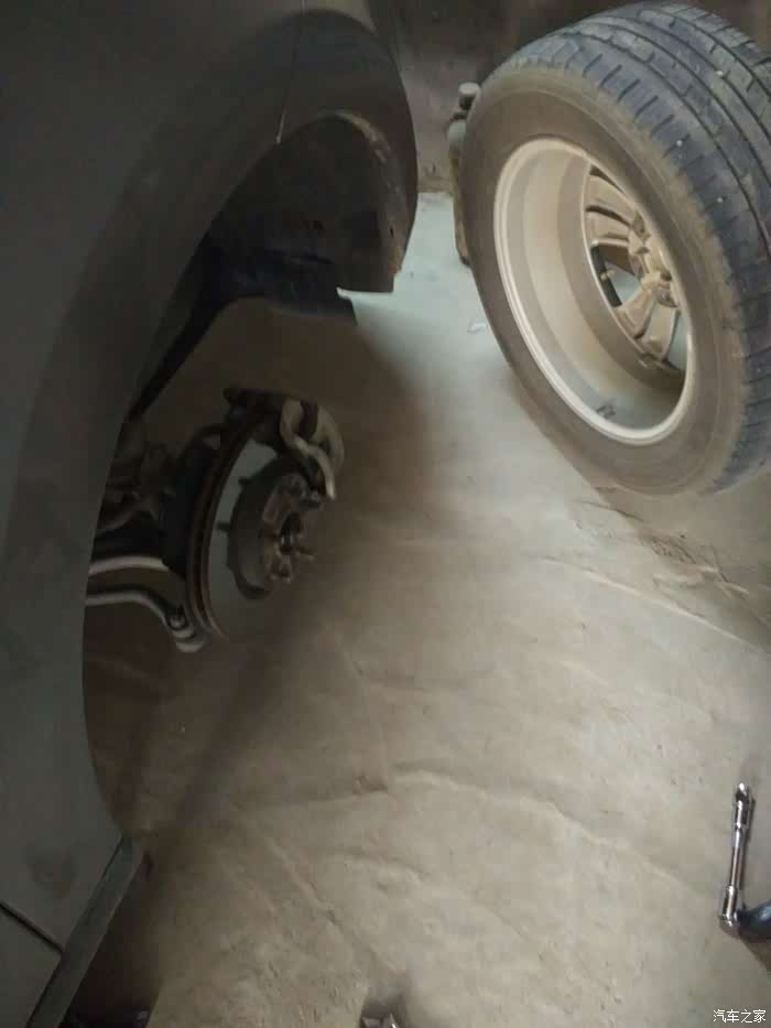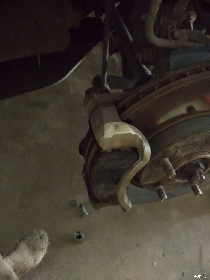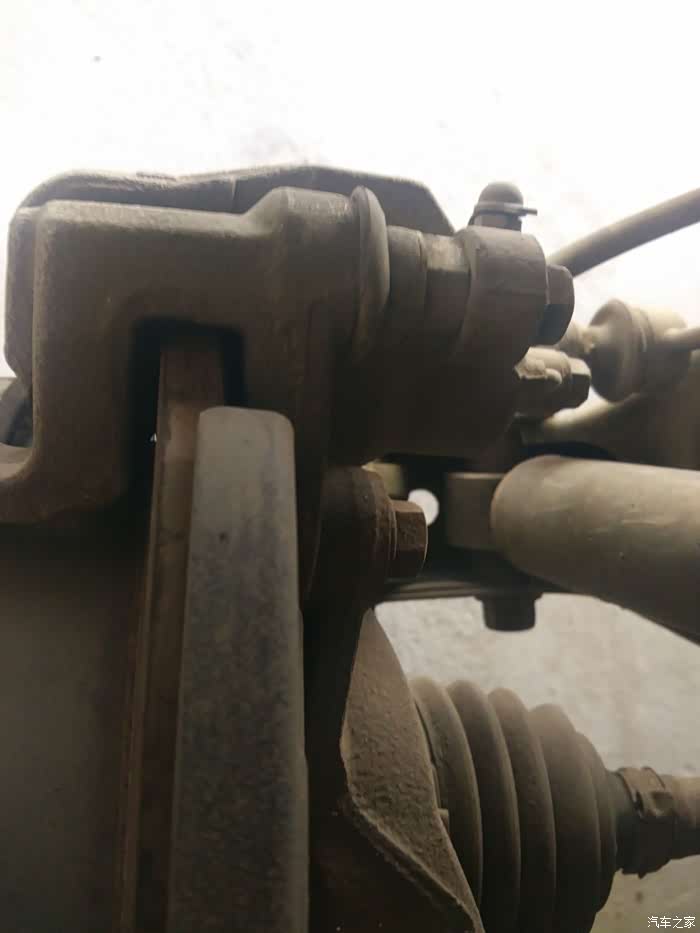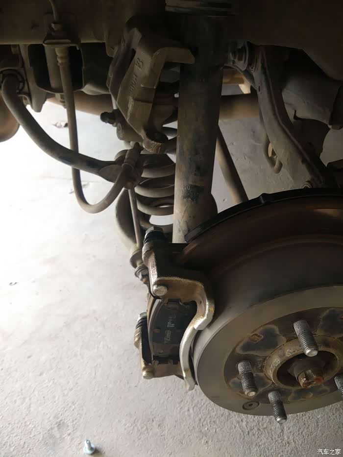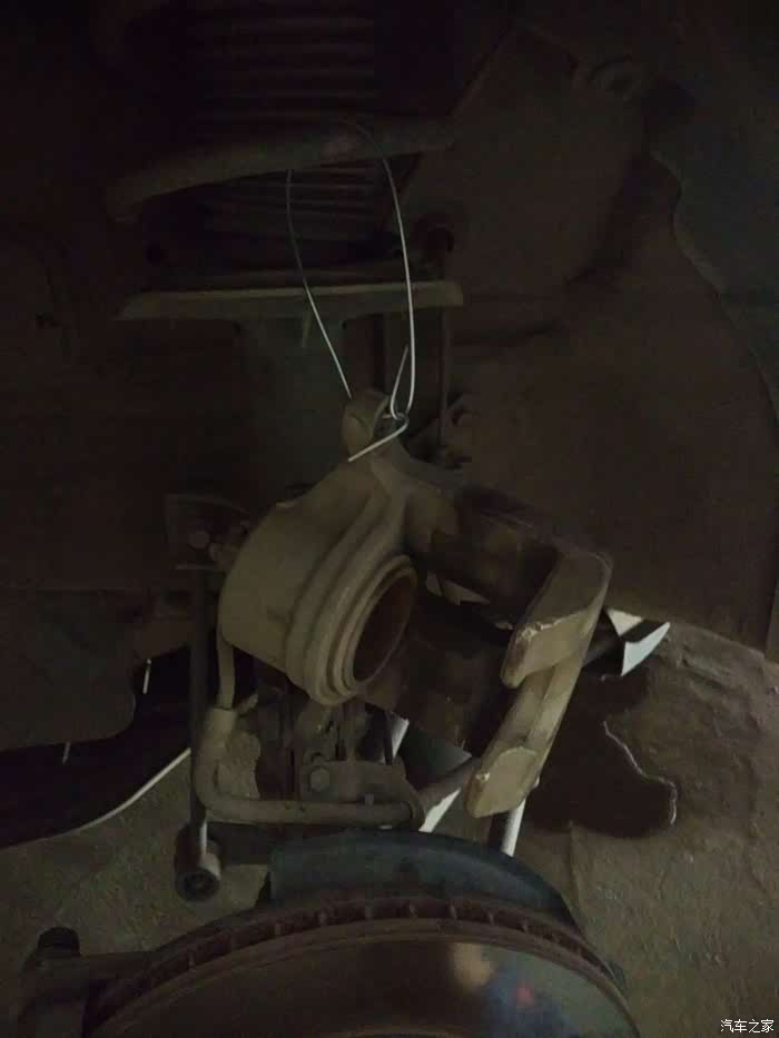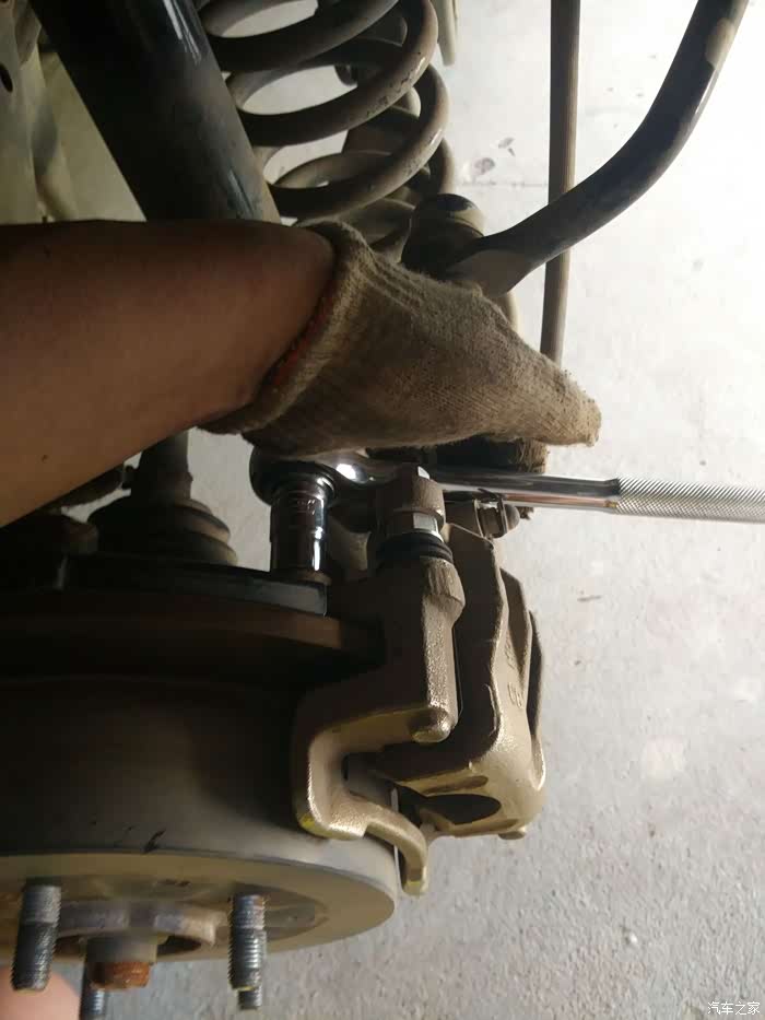 拆卸左前刹车分泵,分泵液压座太重,为防止拉断刹车管,使用铁丝悬挂在减震弹簧上面,分泵刹车片座固定螺栓是17毫米的。