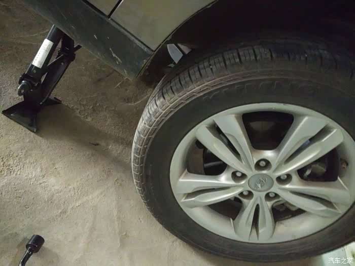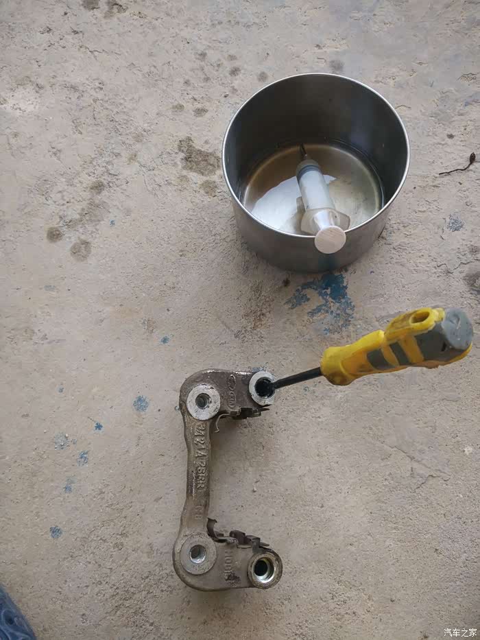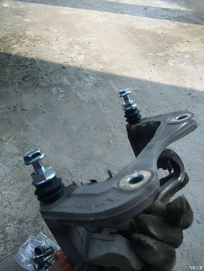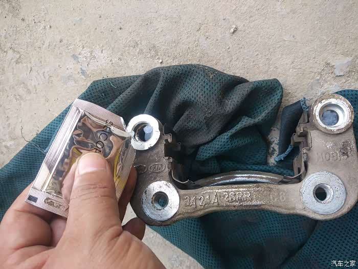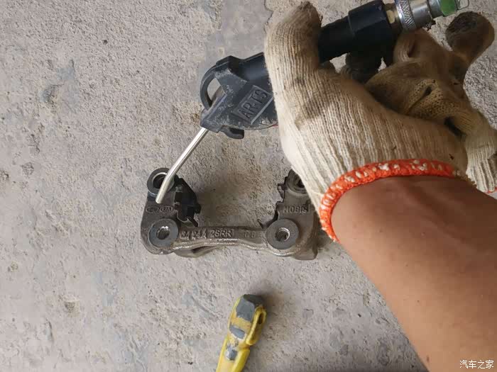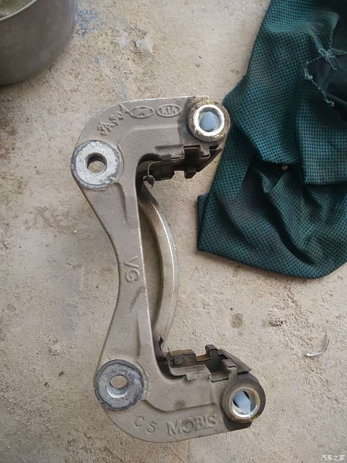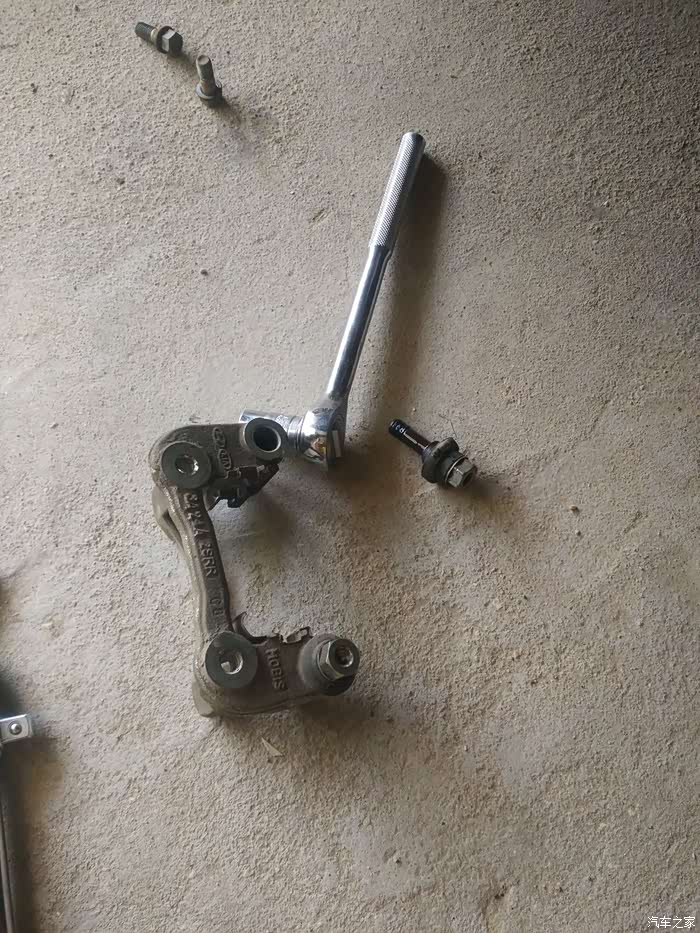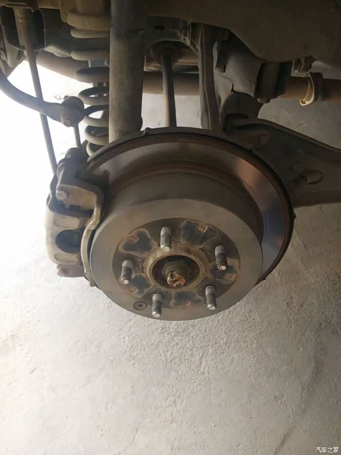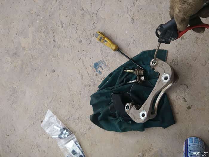 拆卸左前刹车分泵,分泵液压座太重,为防止拉断刹车管,使用铁丝悬挂在减震弹簧上面,分泵刹车片座固定螺栓是17毫米的。