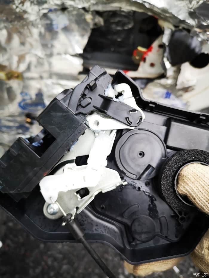 换锁过程中全程手套的,没办法拍照,只能语言描述了,见谅。另外请注意,要换锁块的朋友,换锁块注意1外门拉手有个u型卡一定要卡在锁块上!2装好后,没锁紧螺丝前,必须先测试拉线和锁闭钢丝是否有效,3安装完毕后不要急于关门,先测试门锁是否正常开启,童锁是否有用,内锁是否有效,外拉手是否正常使用,4所有测试完毕再关门检查遥控是否正常锁车和解锁。为啥我知道这些并且提醒你们……哎,说多了都是泪,门打不开我现在一把尺子一根钢丝都能开了。