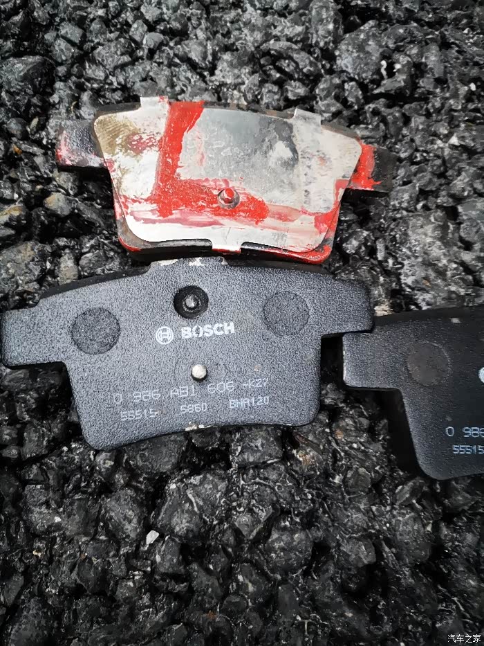 上面沾了红油漆的是我车上拆下来的金麒麟的刹车片,注意是后刹车片!博士适用此车型号的片号为0986 ab1 606 -kz7!!各位12--13款的朋友记住了!这可是我白买了4付刹车片才确定的型号