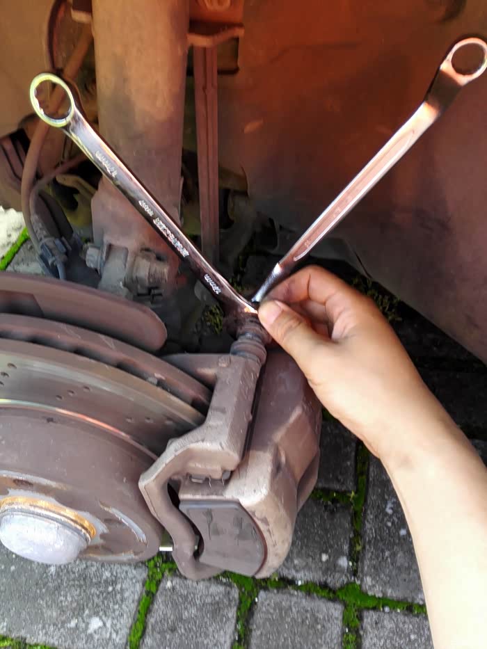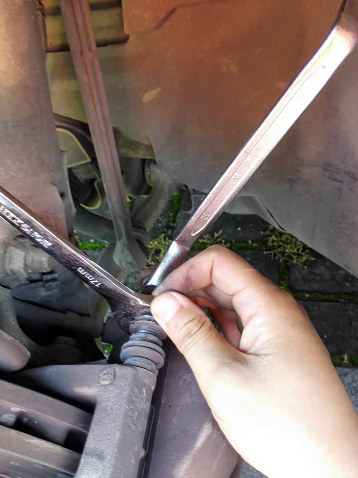 内侧是13的螺栓(这个螺栓买刹车片时有送新的,等下换掉)外侧用17的开口扳手
