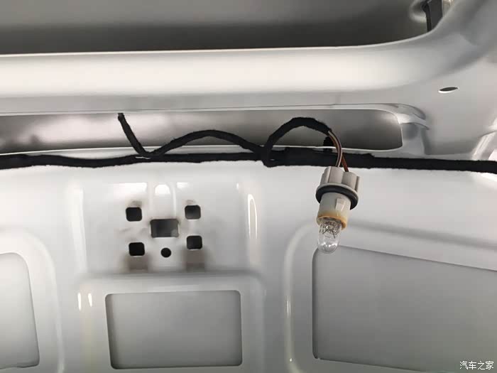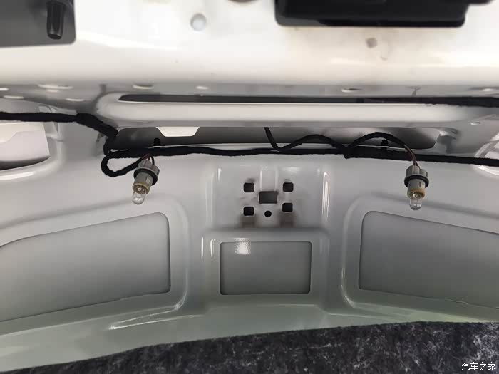 后来,牌照灯壳没还成功,原因是有个牌照上部的塑料件拆不下来,螺钉卸了似乎还有内部其他卡子,因为不了解安装方式,不敢随便用蛮力,毕竟有之前牌照灯座的教训,努力几下之后放弃。只换灯泡了。图中牌照灯所在的平面上的黑色塑料罩,拆不掉。