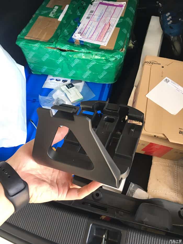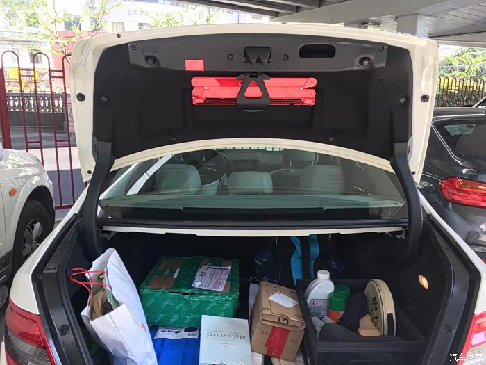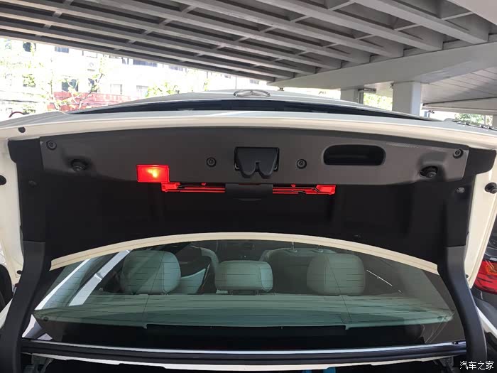 下来之后记得托着,里面后备箱灯后面的插头要拔下来,拔掉之后,整个塑料罩就可以下来了。
