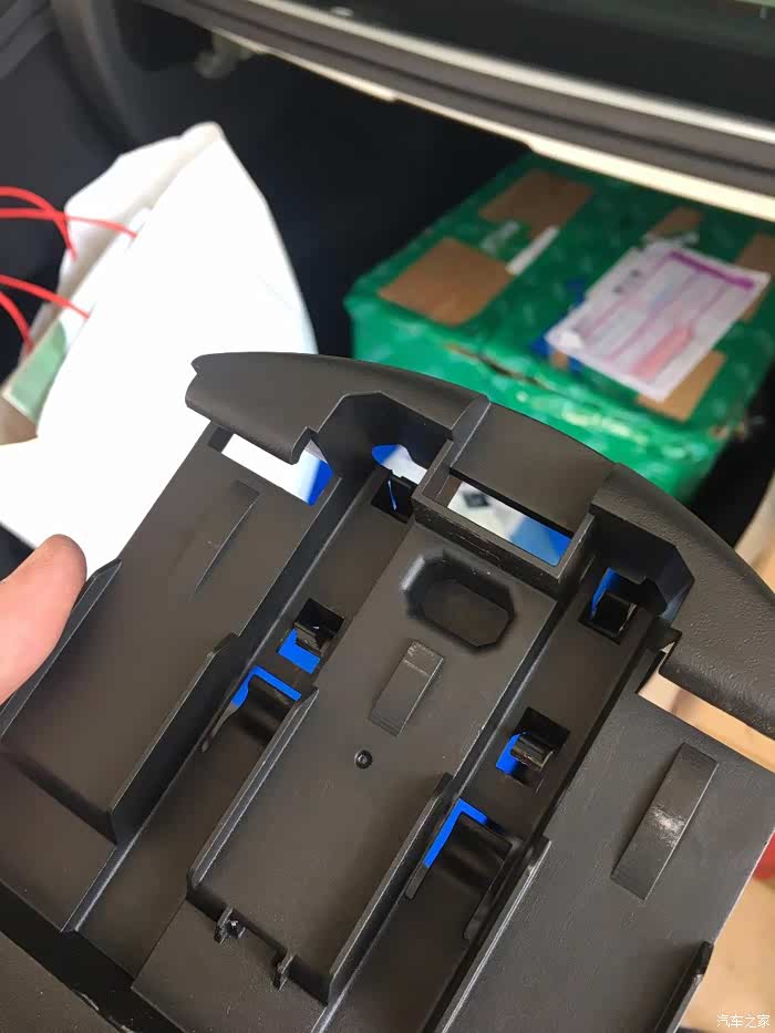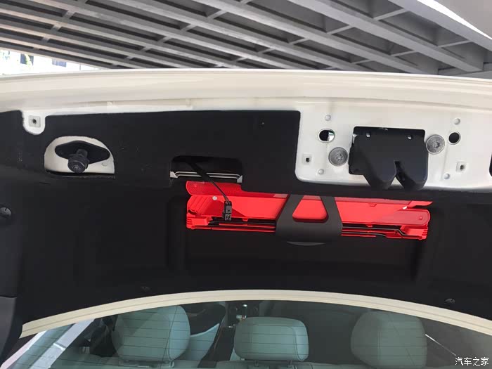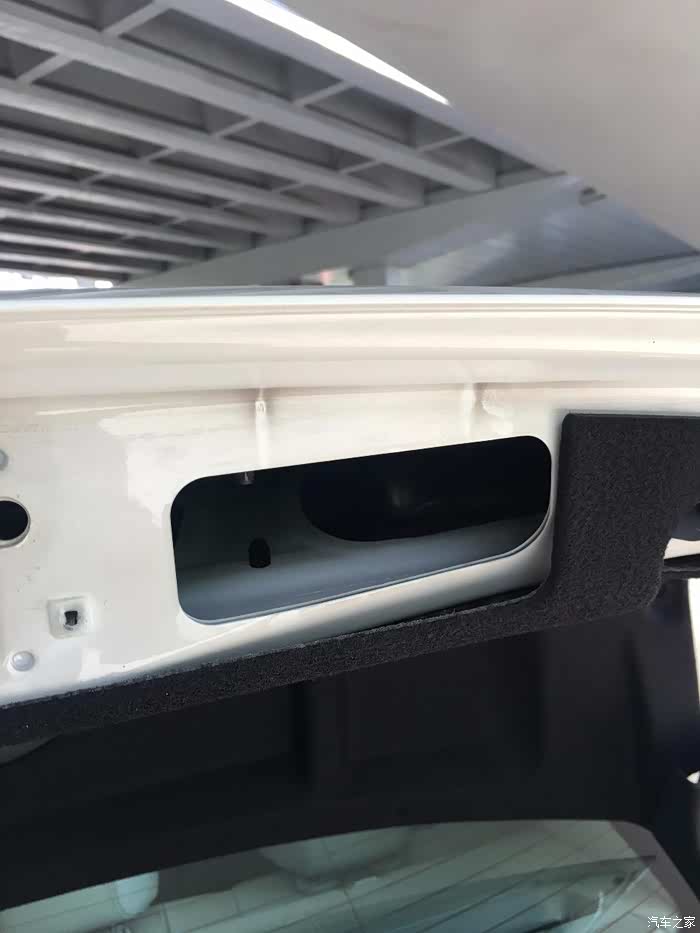全部到位之后,就剩下后备箱里面把手凹陷处的结构在支撑着棉毡不掉下来了,顺着凹把手的方向,推进去,棉毡就下来了,棉毡周围收边的地方很锋利,注意手,我就不小心划了一下。