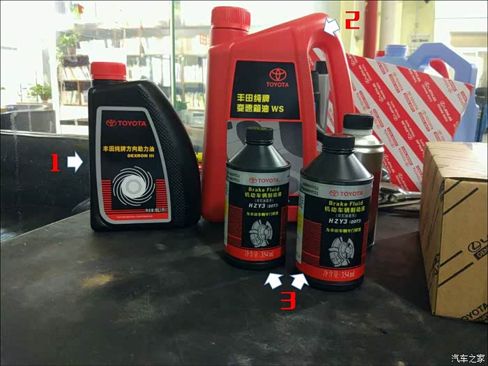 这是今天需要更换的油液:1箭头指示是方向助力油(1L装);2箭头指示是变速箱油(4L装 又叫波箱油)3箭头指示是制动液(又叫刹车油 354ml装 这个比较特别!)