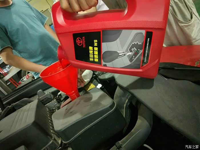 废油抽取完必后,就可以倒入新的了,正在加波箱油;