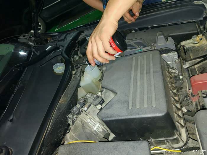 把清洗剂倒入喷油嘴免拆清洁专用工具(名字有点长)