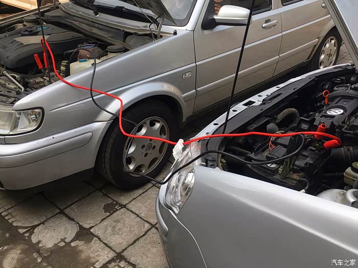 连接好搭电线(因为考虑到电瓶已报废,所以负极直接接在电瓶极柱上,其实这是错误接法)。