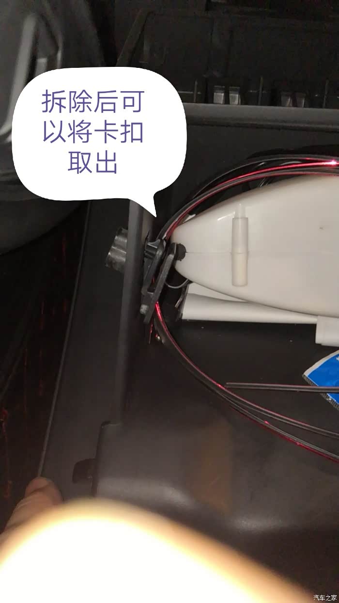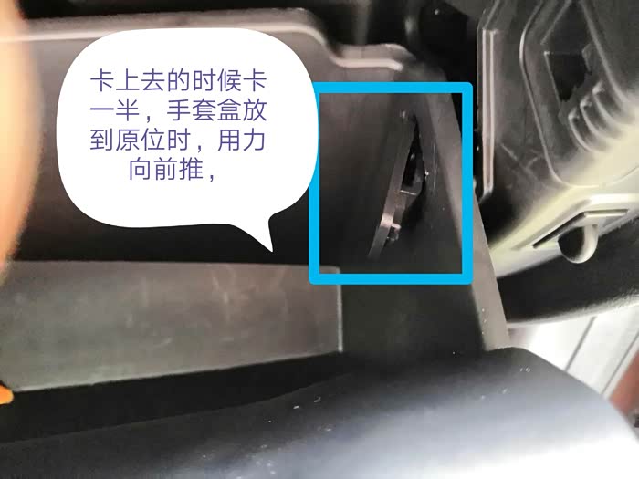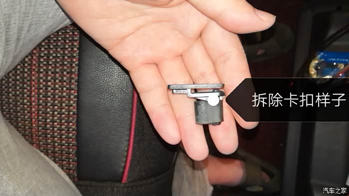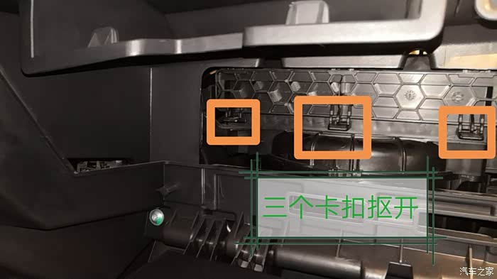 拆掉的卡扣样子,中间缝隙是卡住手套盒厚度,拆除空调滤芯保护壳。