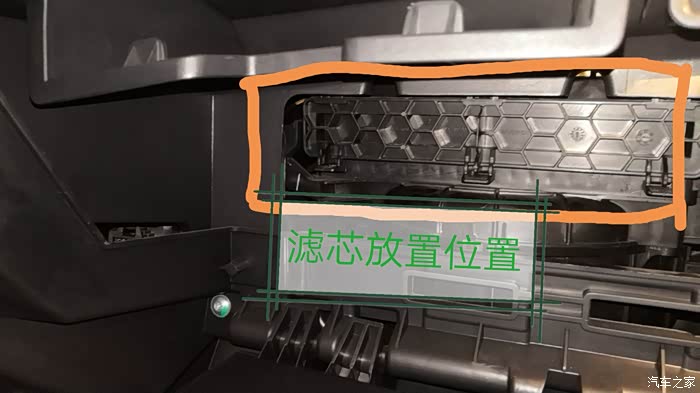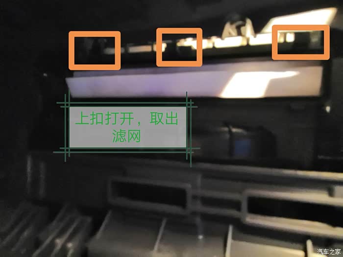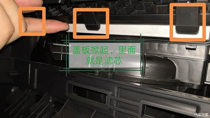 再将上面卡扣抠开,里面白色的就是空调滤芯,拉出滤芯更换新的。