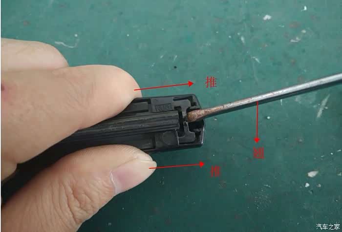 仅拿一头做展示,用小一字螺丝刀照图所示,翘起雨刷器金骨架,其实另外一头更好翘