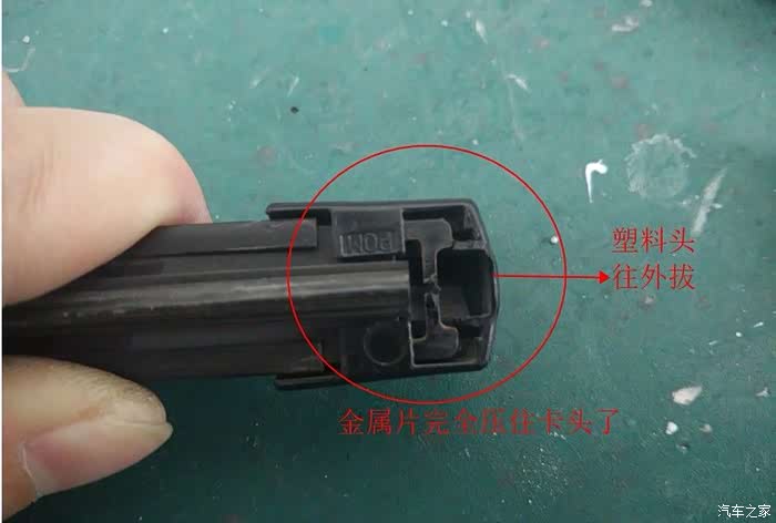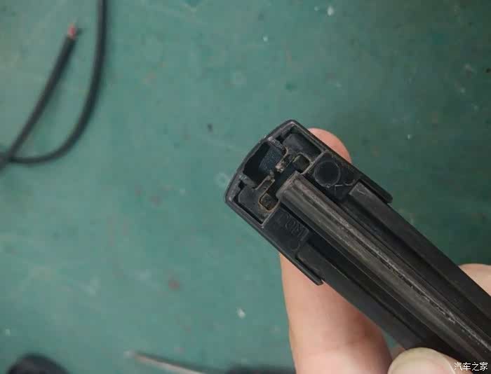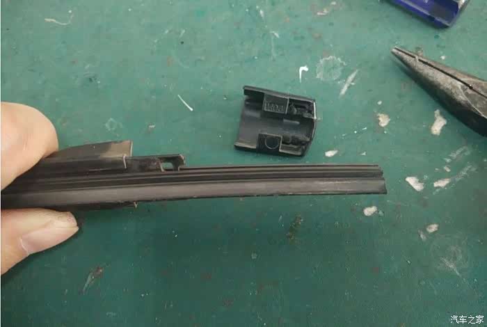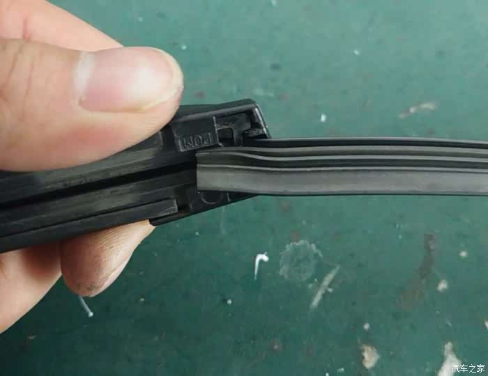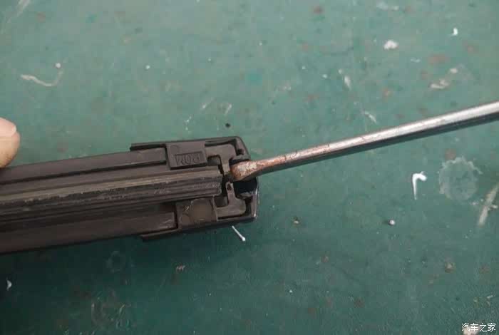 抽出雨刷胶条。在这多说一句细心的人会发现,雨刷胶条由于长时间压在玻璃上,会往一个方向歪,其实,现在把雨刷胶条抽出来,换个方向在装进去,还能在一小段时间的,呵呵……