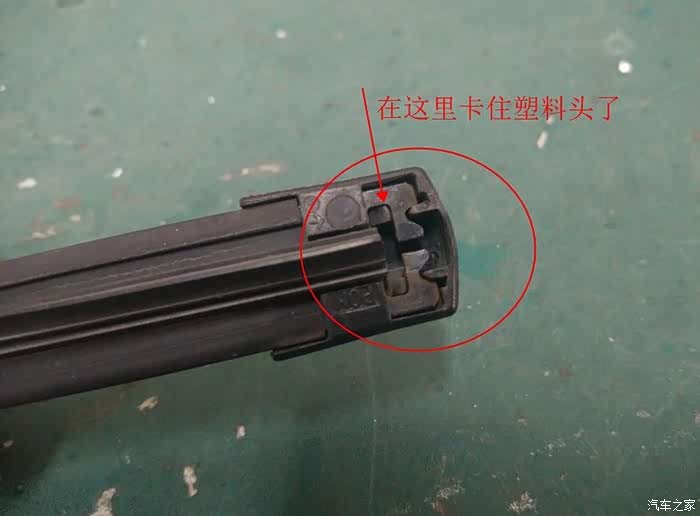 看这张图,其实雨刷器头两边的方孔,就是卡住两根金属骨架的,也可以向上面说的那样,翘起金属骨架,把整个头拔下来,不过最好先泡泡热水澡,小心翘坏最后还是那句话,有事没事捣鼓一下,修不好还拆不坏吗,哈哈……