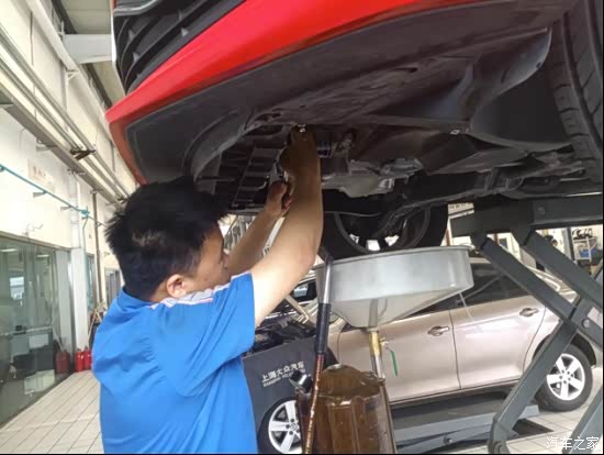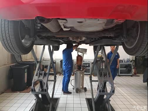 把车子升起来,先检查检查裙底,然后卸下放油阀,开始放油。