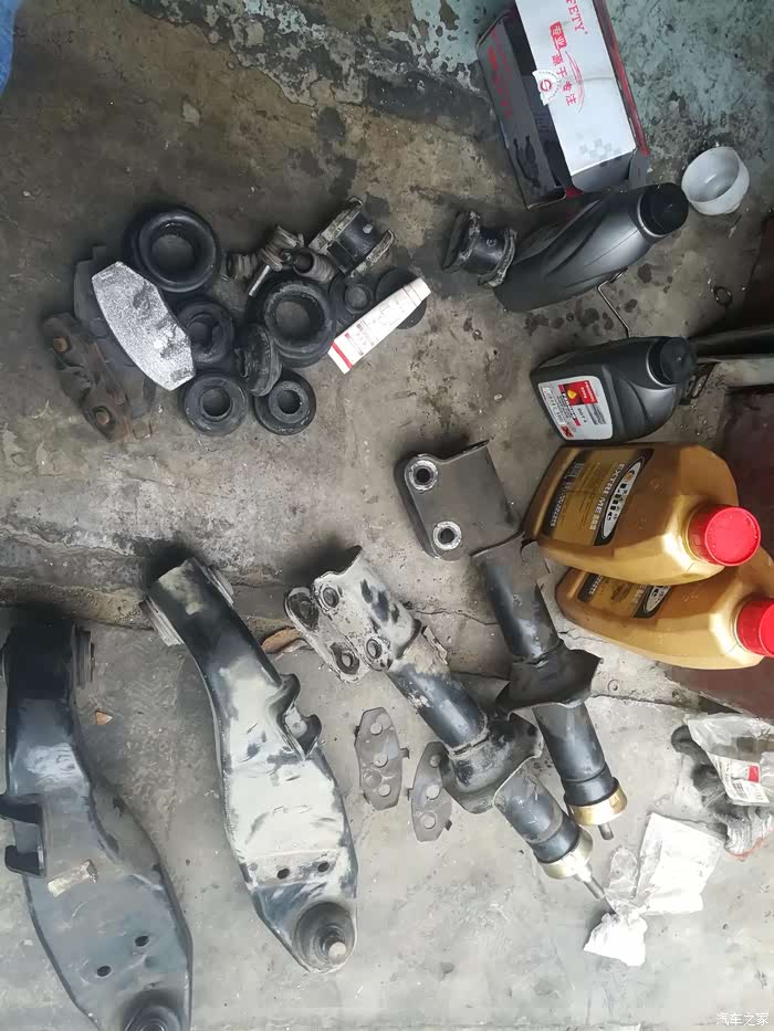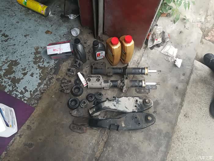 这些就是这次底盘大保健所更换的全部配件,两根前减震器、两只下摆臂、两只前稳定杆衬套、四只前刹车分泵伸缩销、四只前止推杆胶垫、前 后刹车片、前减震器缓冲胶垫、两只前减震器平面轴承、刹车油、变速箱油、防冻液等等