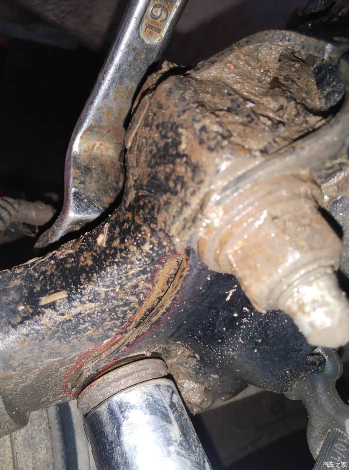 拆这两条前述螺丝之前用尖东西在羊角上做标记,这样装的时候对齐标记线,就不用四轮定位了。这是我自己第三次拆这个,前两次是换前轮轴承。哈哈,县道松手跑上一段路也不偏,从没没定过位。