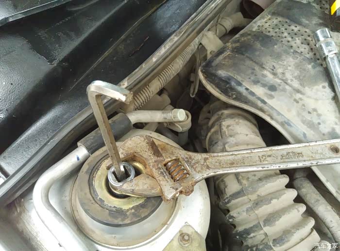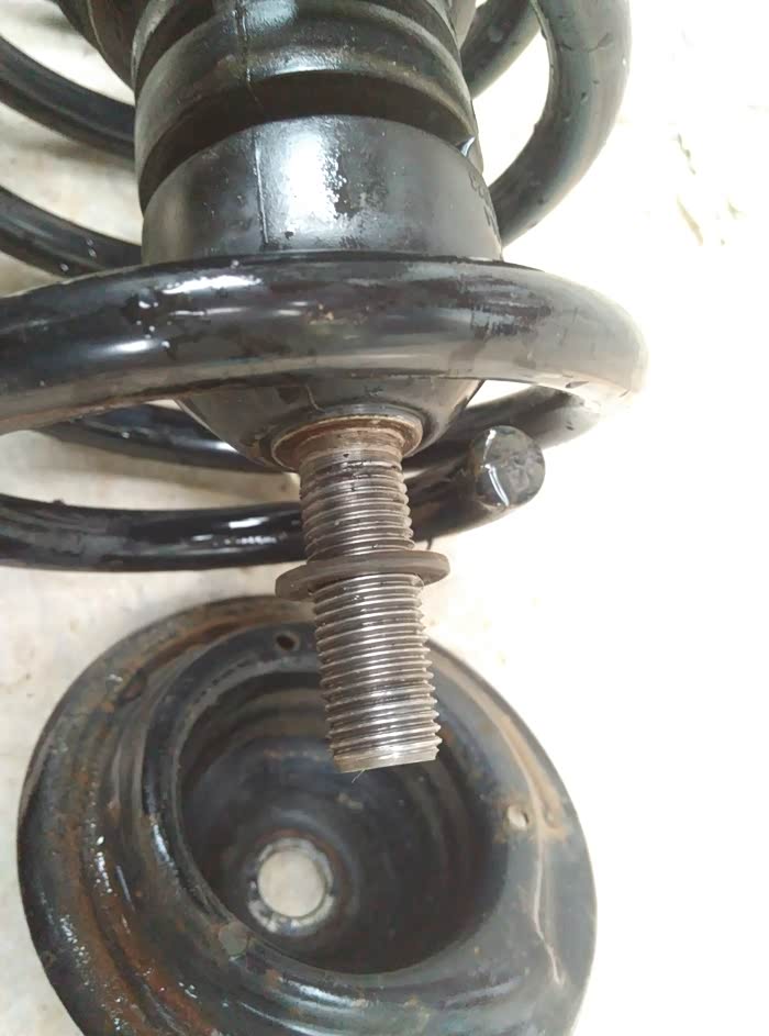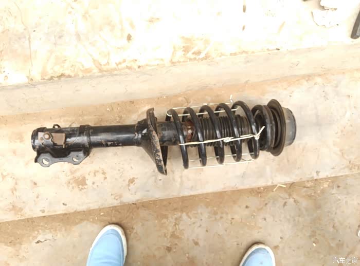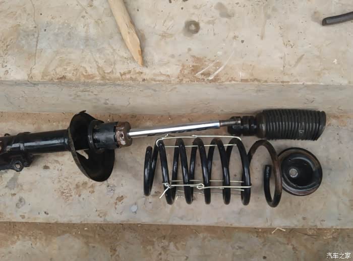 上面螺丝全卸掉就可以拿掉减震器了。在没压弹簧工具的情况下,用铁丝捆紧弹簧,捆紧,捆紧,便于拿掉顶胶后能顺利安装上托盘和新的顶胶,要不就麻烦一点。