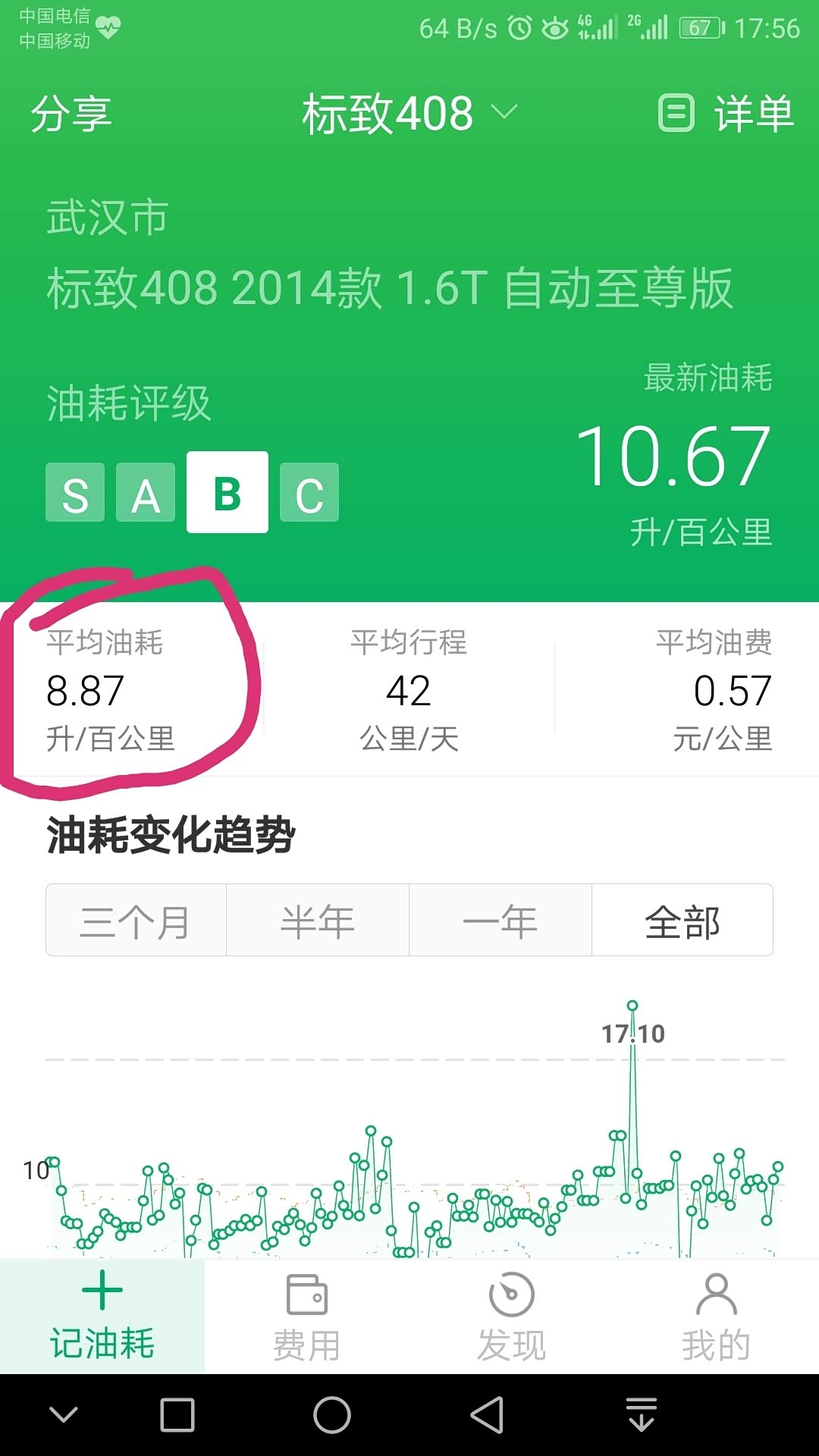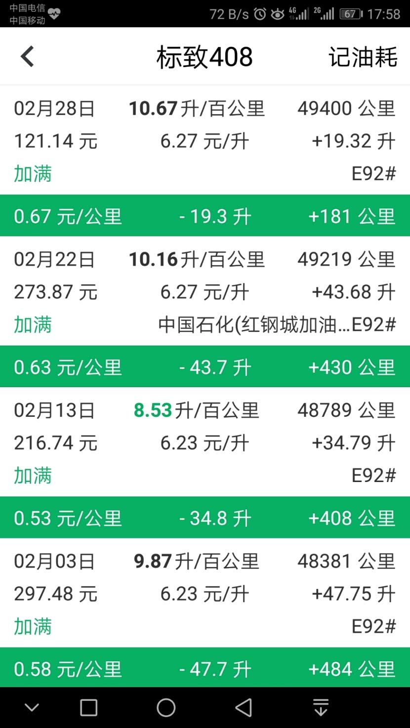 近段时间油耗,都在10个左右。