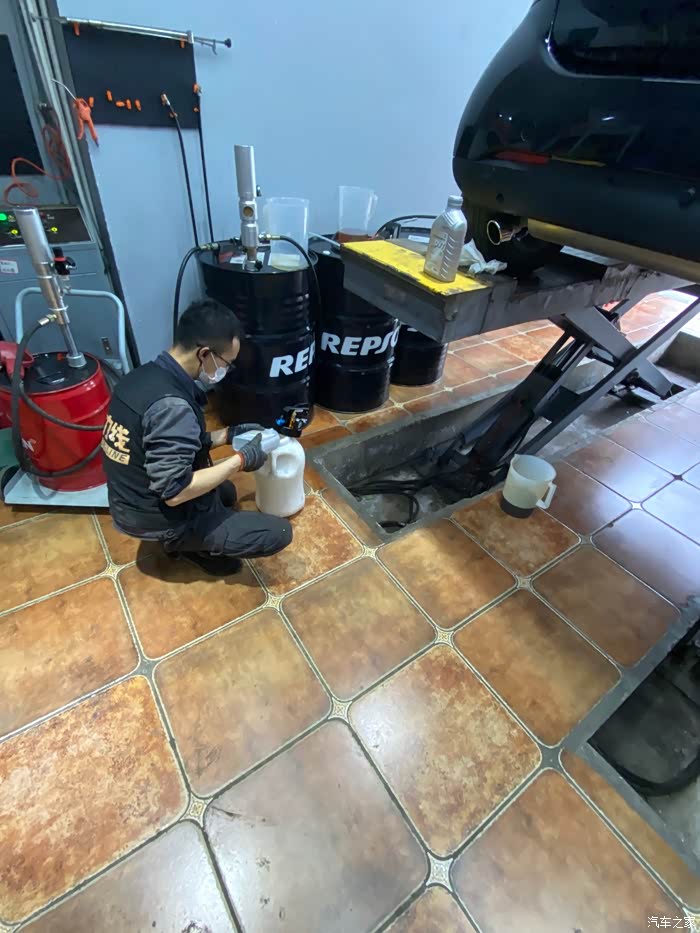 精神小伙师傅开始倒新的机油在桶里!smart 453 1.0自然吸气 更换变速箱后:一桶1L 需要更换两桶!(备注:0.9t 不知道🤷🏻?♂?需要几升)