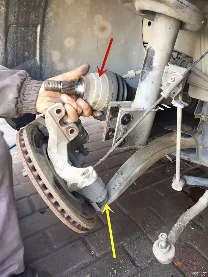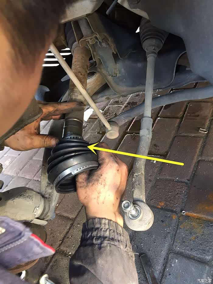 上面讲了,只用拆掉3个螺丝,即减震器的两个,转向臂的一个,最下面的下支架螺丝不用拆。(至少这个修车店的师傅没有拆),红色的箭头就是传说的外球笼了。后面黑色的球笼防尘套(橡胶件)用了6年,终于报废了。已经断掉了。这次就是要换掉它。如果不及时更换,就要换整个球笼或半轴了。