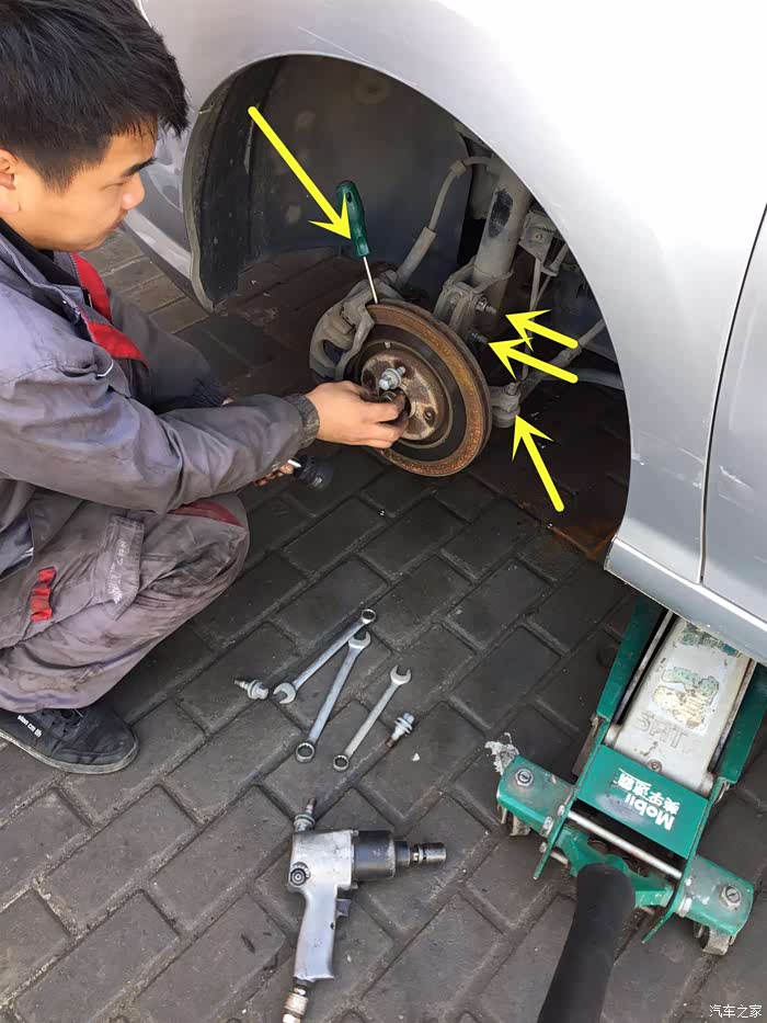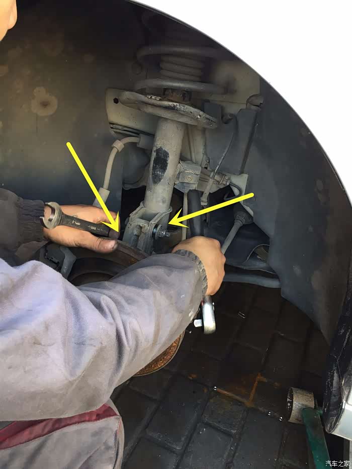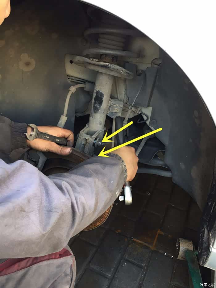 起子别住刹车盘,开拆大母螺丝。因为我之前已经拧松了大母螺丝,后来想到去修车店还是要拧下来,就没有拧太紧,所以这个师傅拆的时候比较省力。另外3个黄色箭头是要松的螺丝,两个减震器的螺丝,一个转向臂的螺丝。
