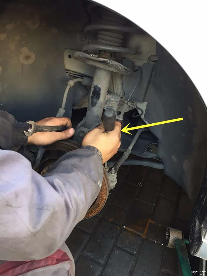 拿起大榔头,光光光,不要心疼,不要砸错位置,紫色箭头指的位置,可以看见榔头砸的印子。砸两下就松了,往下一拉就下来了,这个转向臂是可以上下左右活动的。