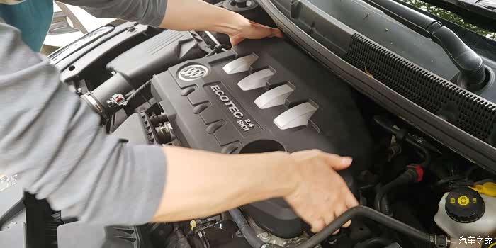 4.再向上突然用巧力提起发动机塑料盖板(注:除加油口处另外三个角都有一个橡胶扣扣在金属柱上)。