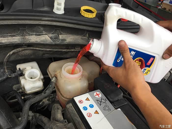 添加口添加防冻冷却液,我一共添加了两瓶半,应该是5KG,多余的留着,第二天再看看水位,不够再加