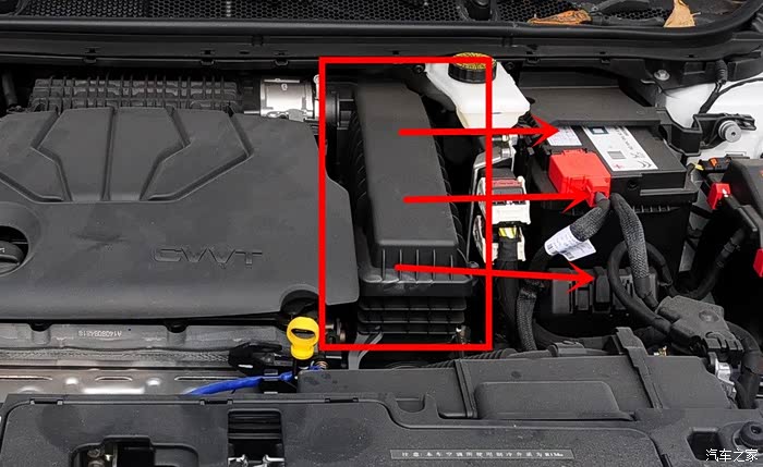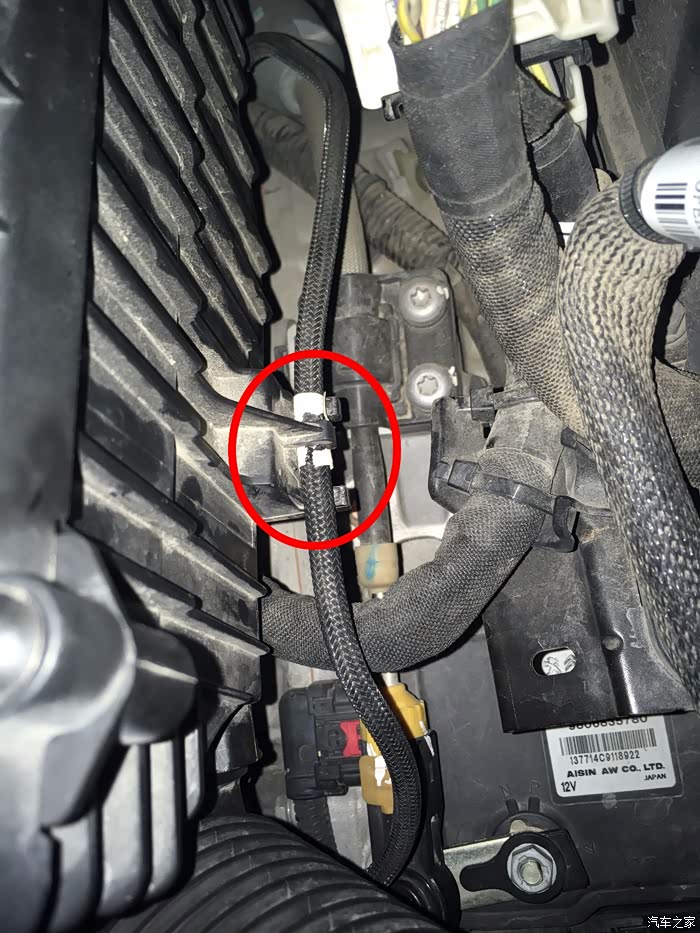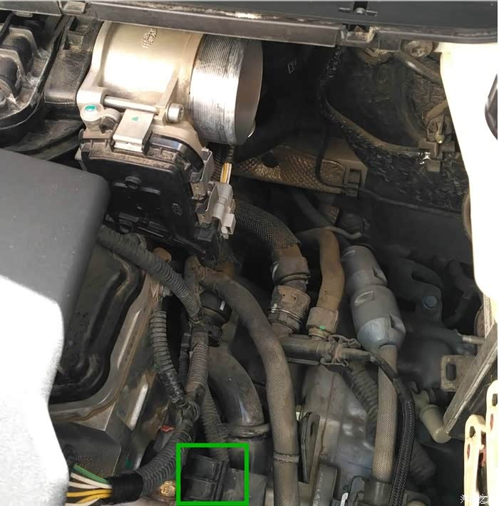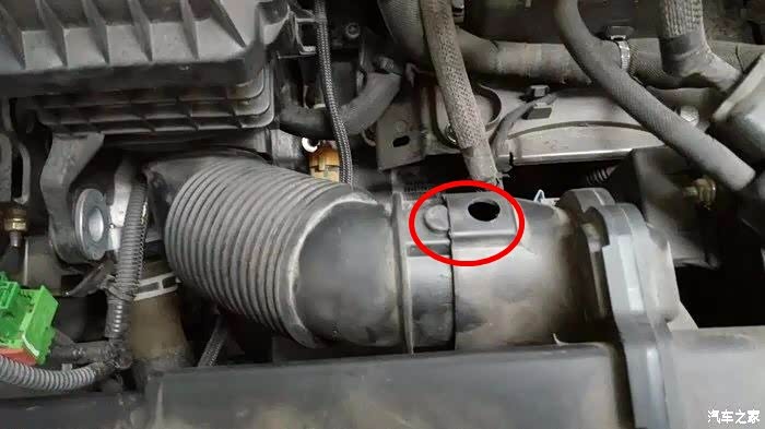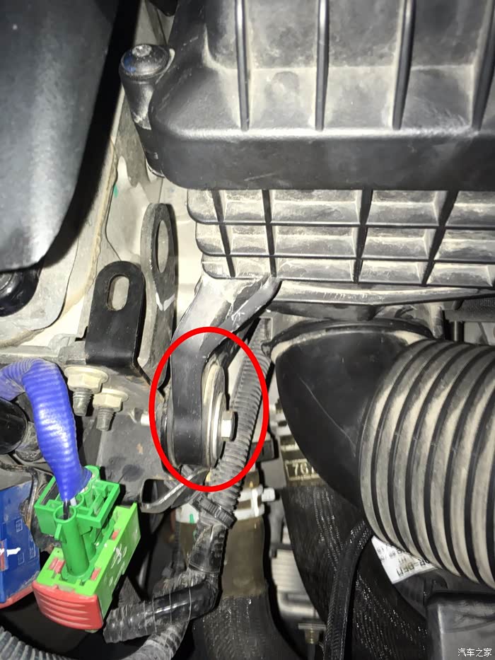 拆下来后,注意绿色的框的位置。这个位置是用来卡空气滤芯盒子的支架的,看下图绿色框。装回去记得卡好。