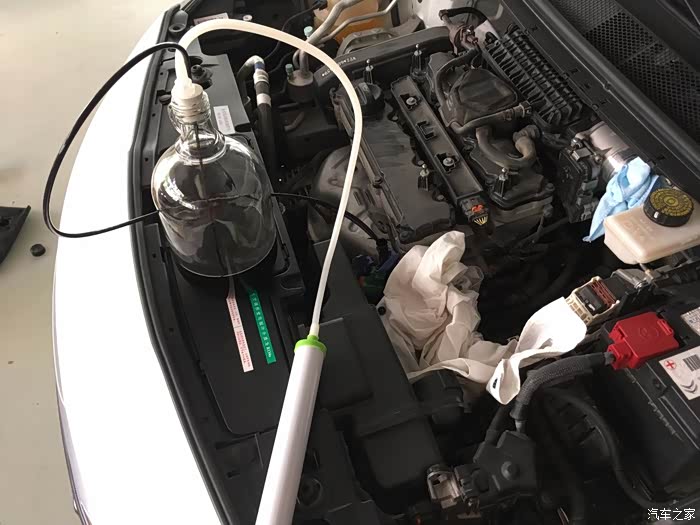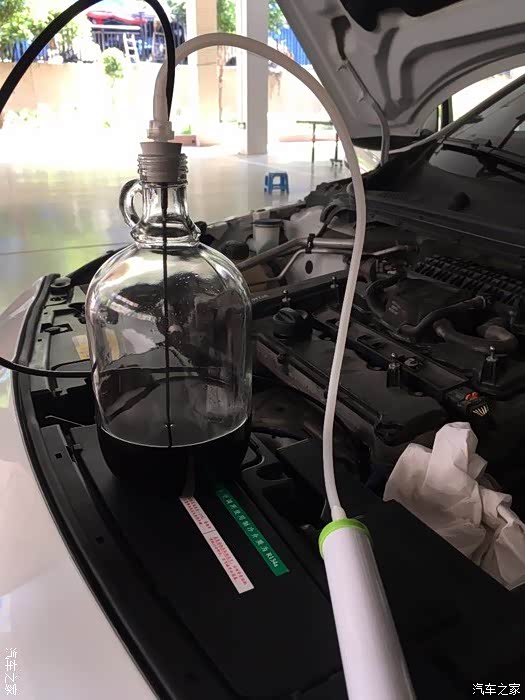 这个抽机油装置是网上买的,手动的,五十几块钱。拔出机油尺子,管子从机油尺子里伸进去,慢慢伸进去,伸到底会有感觉的,然后就可以开始抽机油了。热车后抽机油速度出乎我预料。一瓶满用个一分钟而已哦。最后抽了4L废机油左右出来。