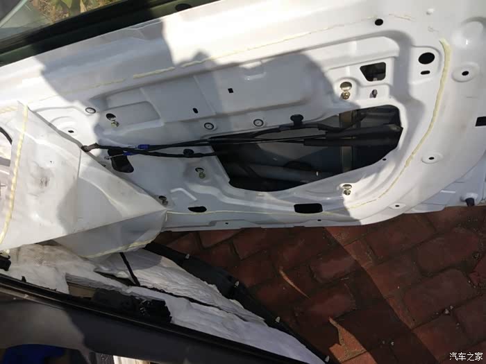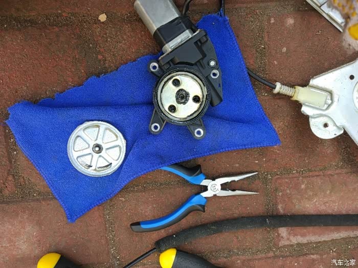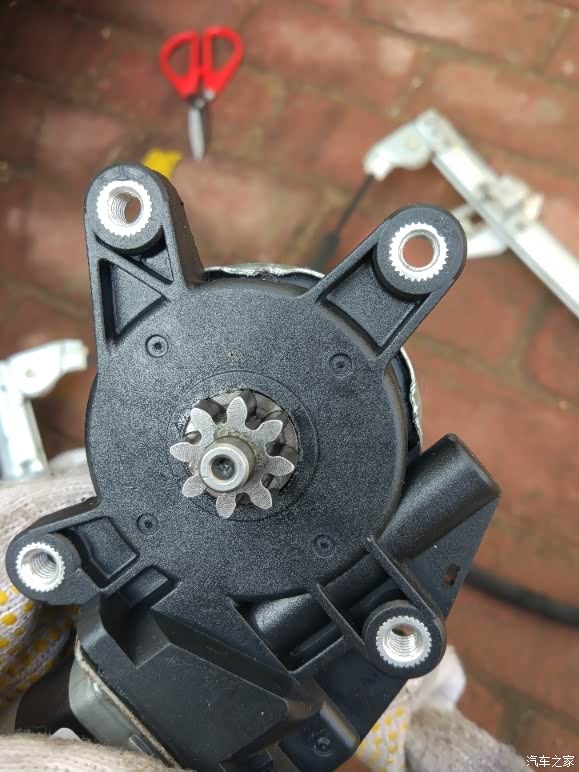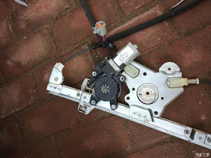 电机总成,一共5颗螺丝,10号套筒拆的。想拿下来要先取掉玻璃,最好有人帮忙提一下。玻璃俩边下口和升降机有卡扣连接,手指按不到位,我是用一字起翘的,垫上毛巾小心用力,这个地方没点动手能力确实不好拿