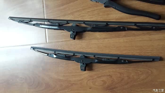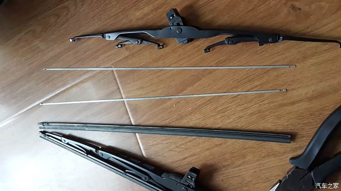 拆下的雨刮胶条和内部支撑用的两条铁片。退下雨刮胶条的关键就是这两条铁片。用钳子夹住雨刮胶条向外拉出一些时,也可以把两条铁皮先抽出来,之后就没什么难度了。