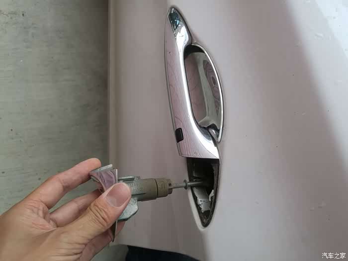 堵头取下来,里面有一颗螺丝固定拉手旁边的门锁。