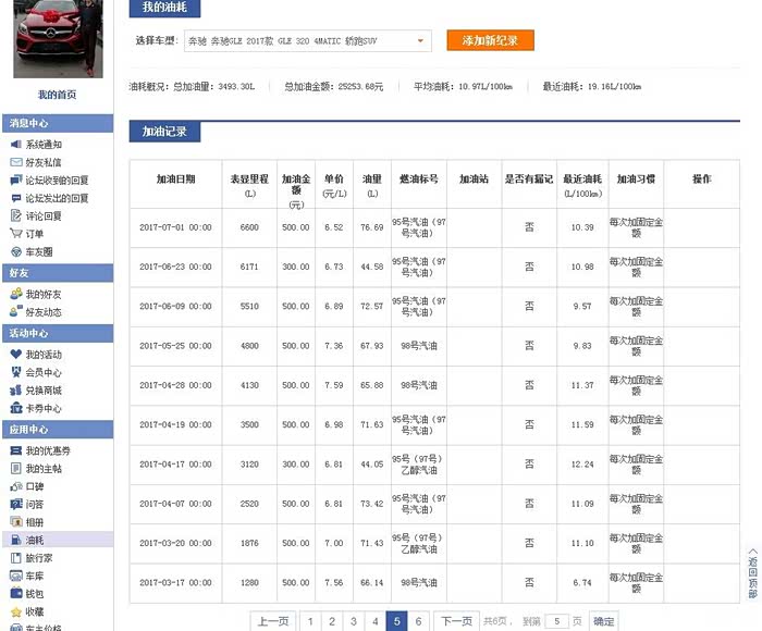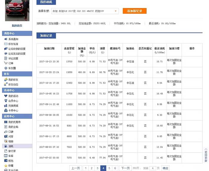 今天在这着重说说GLE320Coupe油耗,一直都有加油登记的习惯,每一辆车都能在油耗记录中找到我加油记录。开车一直比较温柔,所以到目前综合油耗不到11,平均时速39。最低的时候表显7.3,定速80跑出来的~!最近几天闲着无事,想转转成都市区,于是注册了滴滴快车,跑了几天,市区平均时速15,油耗19左右。总的来说,这车还不错,油耗也满意,下面把每一次加油记录截图让大家看看: