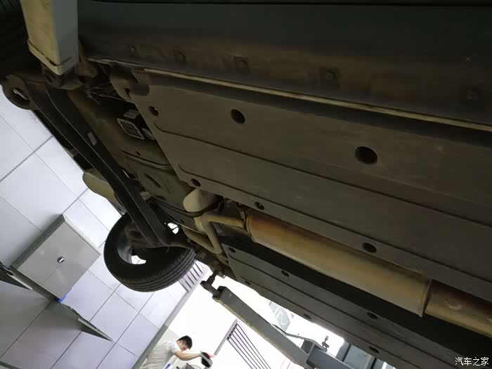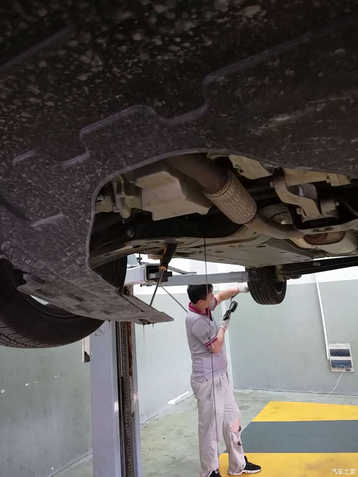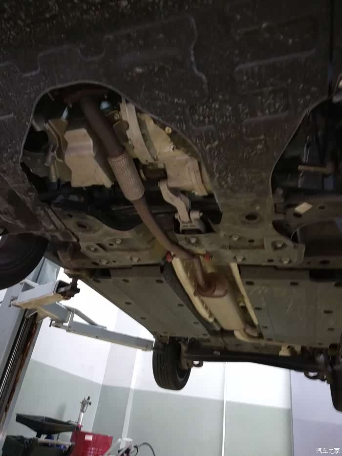 技师松掉机油尺,松了几颗螺丝,就把车子上架了.1.5L互联底部发动机有局部的塑料保护板, 技师拆螺丝的时候指着右轮下方说这个地方应该撞击到了,保护板破了,索性并无大碍.