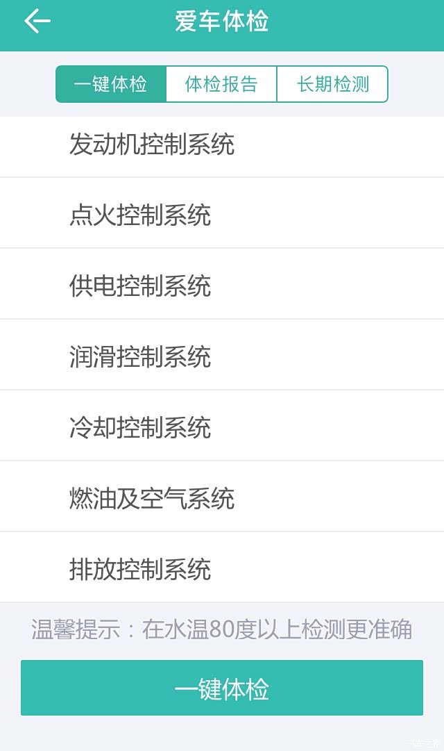 点击“爱车体检”就可以对车辆常规检测,有故障就能读出故障码,要求是车辆水温在80°以上检测更准确。
