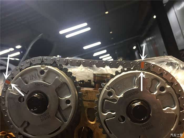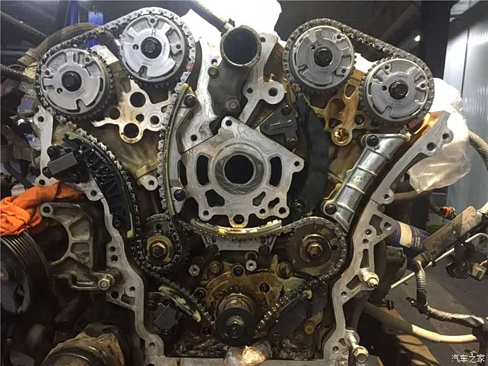 正时外罩壳被拆卸了下来,需要更换的就你眼前的这些链条和正时调节轮。SRX的3.0V型6缸发动机采用了正时链条进行配气相位的传动。正时皮带在大排量车型之中已经是相当的少见了。主要的原因是,正时皮带的抗扭刚性差,大排量的发动机一般都是扭矩比较高,很有可能断裂的风险,虽然皮带的静音性很好,但是链条的超长寿命和免维护的便利性还是胜过了皮带。