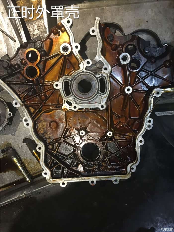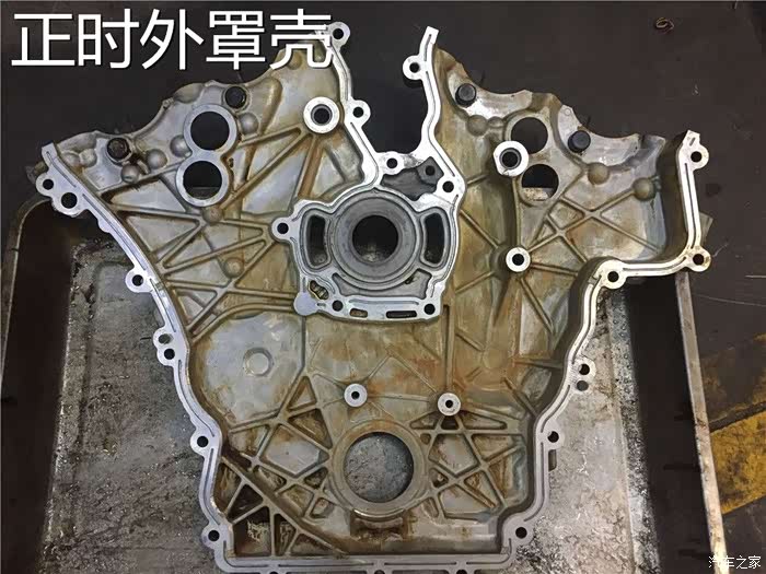 拆下来的正时外罩壳,可以见到外罩壳已经变成了黑褐色。主要是来自于油泥的沉积和发动机的高温,我想,之前车主肯定没有及时更换机油,或者机油的油品很差,应该是差到了最低点。现在的机油清洁能力和热衰减已经做到很强了,只有劣质机油才会有这种状态。