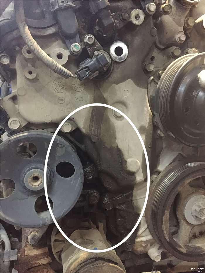 发动机的正时侧盖处明显的产生了漏油的痕迹,油液是上面的正是调节电磁阀滴漏下来的,油液顺着外壳一直向下走,到此处聚集成了一起。看到这个油液的样子,肯定不是短时间的内堆积的,一定是漏了很久了。至于为什么会漏油,我觉得不止是密封系统不行了这么简单。