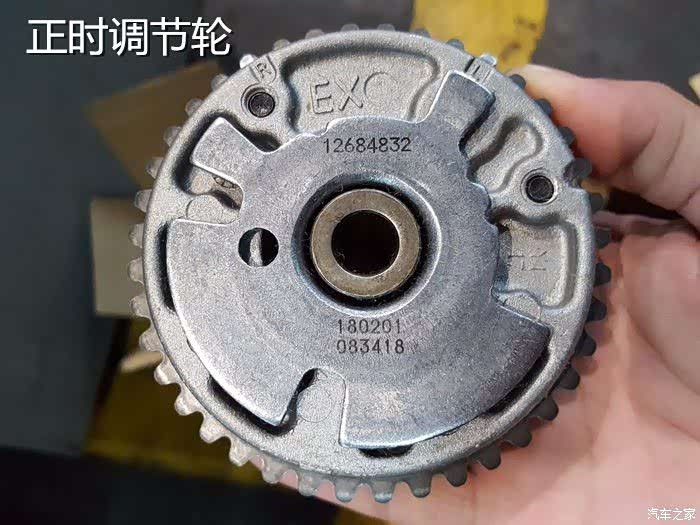 新的正时调节轮,是此次维修的重头戏,出现故障的就是它了。正时调节轮是通过油液进行调节的,也就是利用机油的压力进行改变气门的以前开启角度和延后开启角度,这样就可以实现可变正时了。当然,可变正时是有工作的区间,一旦超过了工作的区间,发动机就会报出故障,动力也会有所变化。