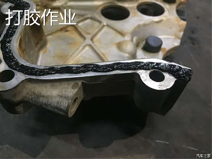 密封胶开始进行涂抹。这个密封胶是有厚度要求的,不可以低于1毫米,不可以高于2毫米,虽然不及生产线上面机器人的涂抹技术水平,但是我自认为自己的涂胶技术还是相当的不错的。PS伍尔特的密封胶,味道非常的大,达到几乎快要让我窒息,特别浓郁的一股子酸味。